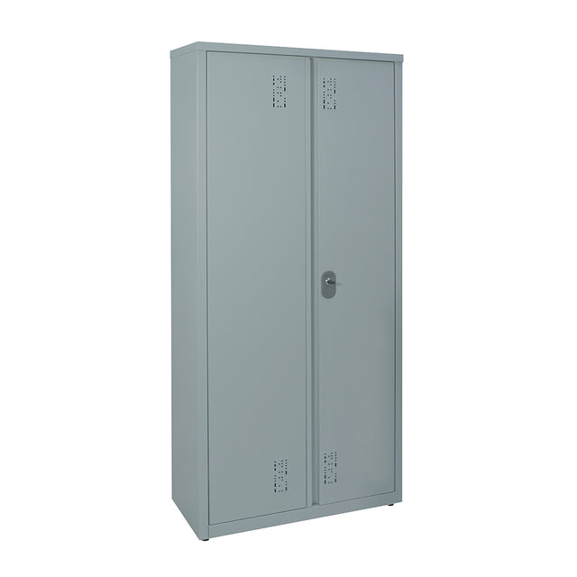 Armário com puxador estampado verticalmente e estampas nas portas permitindo ventilação. Fechamento com fechadura. Pintura texturizada eletrostática a pó. Cremalheira inteiriça nas laterais, promovendo mais resistência e estruturação. Tratamento antiferrugem. Prateleiras com altura regulável.