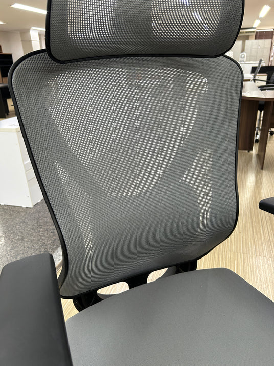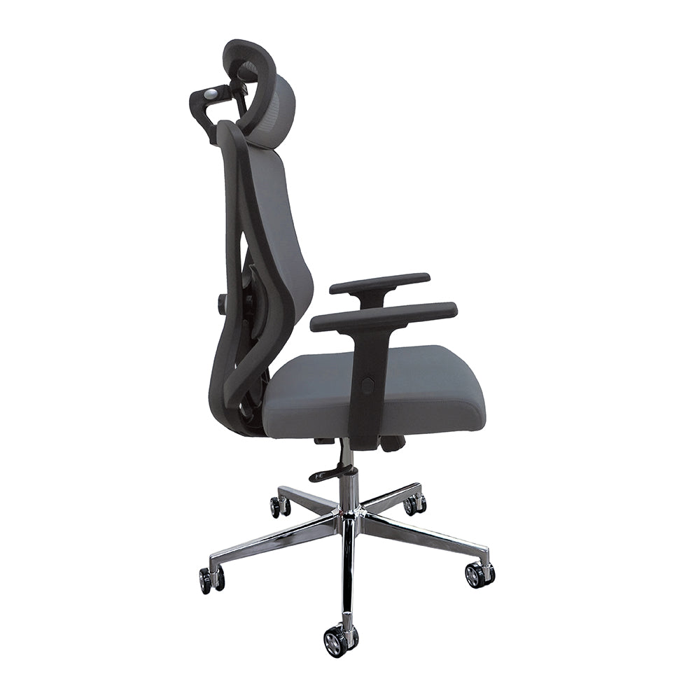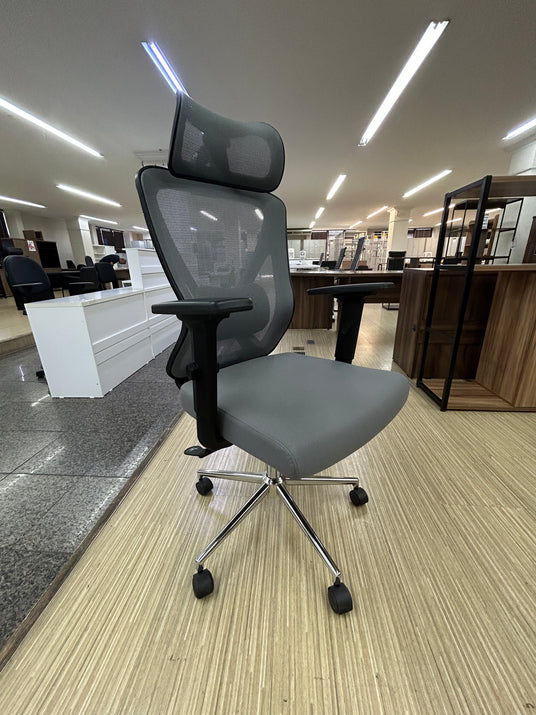 Cadeira Presidente Elite Cinza com Encosto em Tela e Assento em Tecido com Apoio de Cabeça.