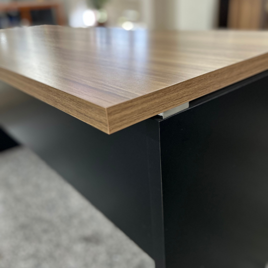 O tampo é encabeçamento em todos os topos com fita borda PVC 1 mm. Painéis laterais em MDP 25 mm. Acabamento em ambas as faces, com laminado melamínico de baixa pressão (BP). Encabeçamento em todos os topos com fita borda PVC 0,45mm. Painel Frontal em MDP 15 mm, todos revestidos com laminado melamínico de baixa pressão (BP) em ambas as faces.