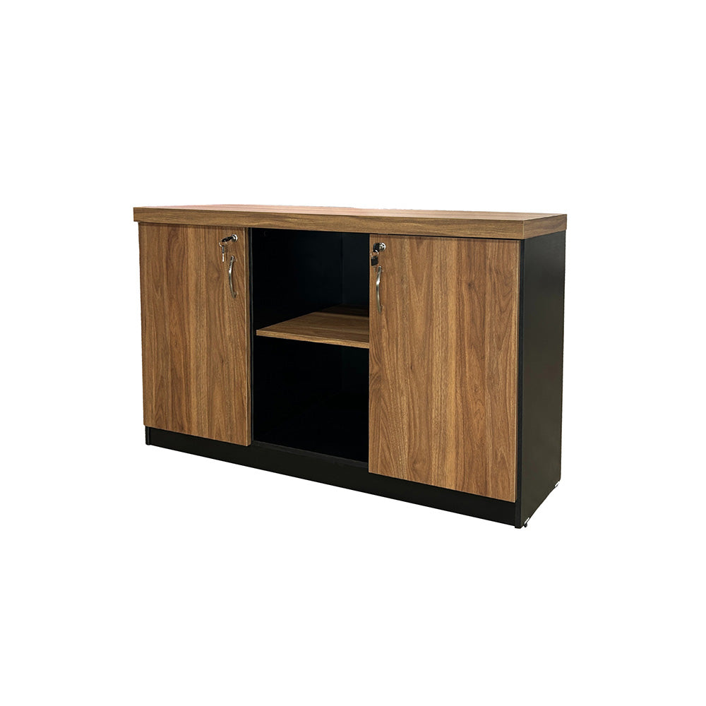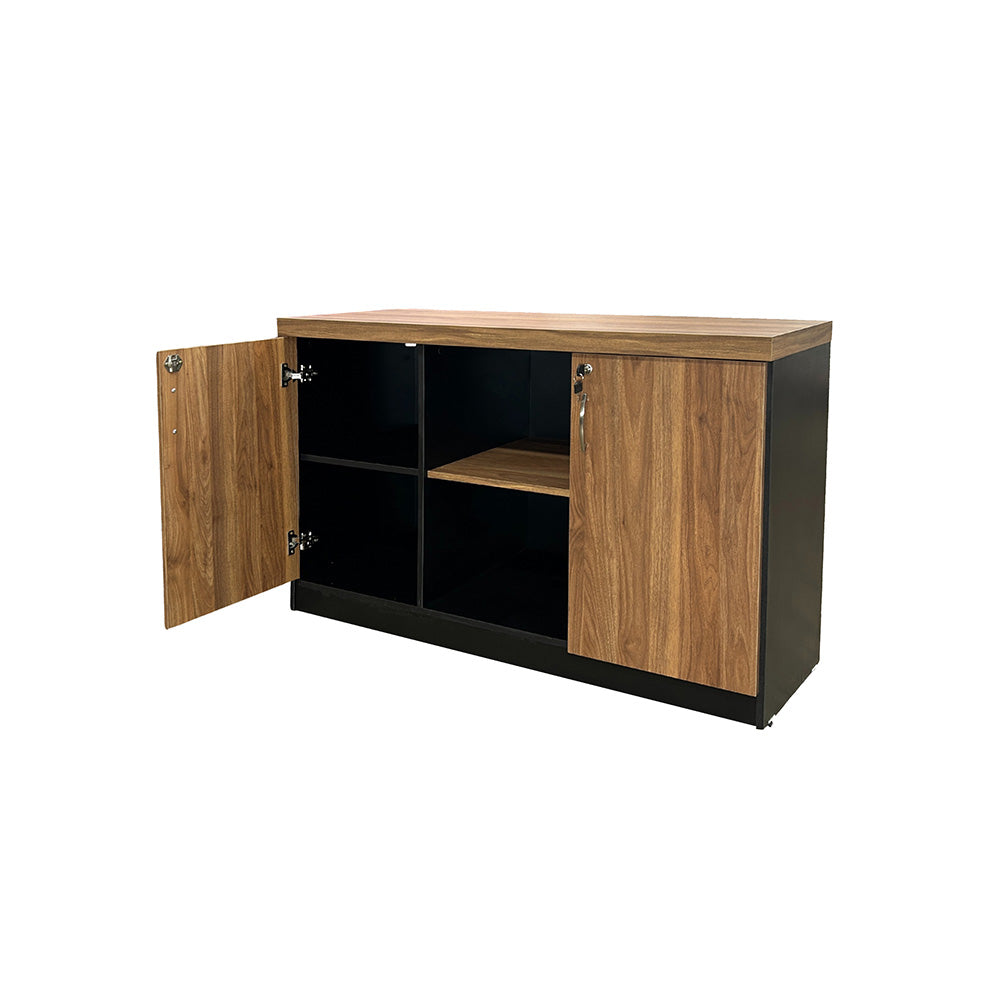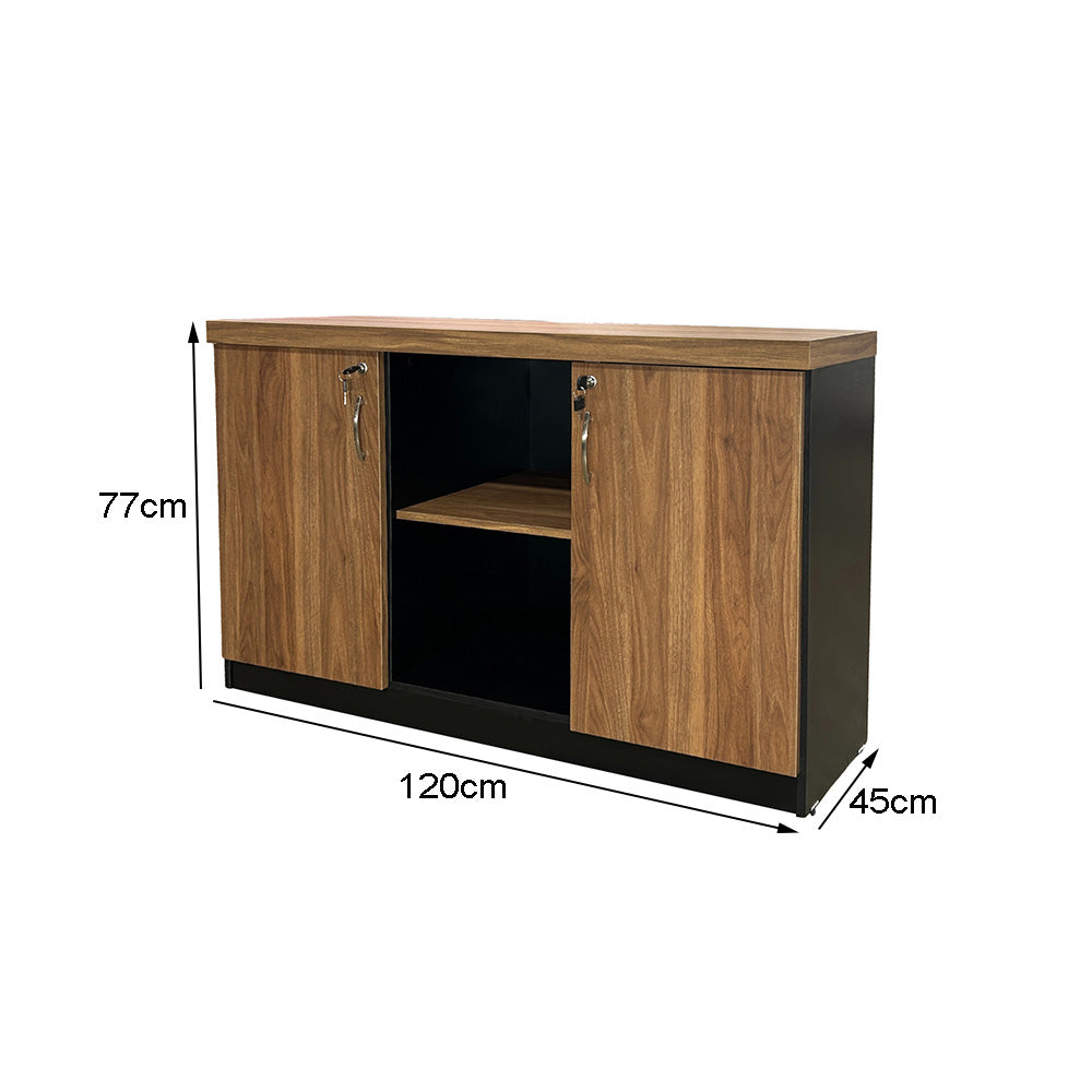 Armário Baixo com portas laterais e vão central com medidas externas de A: 77cm x L: 120cm x P: 45cm.